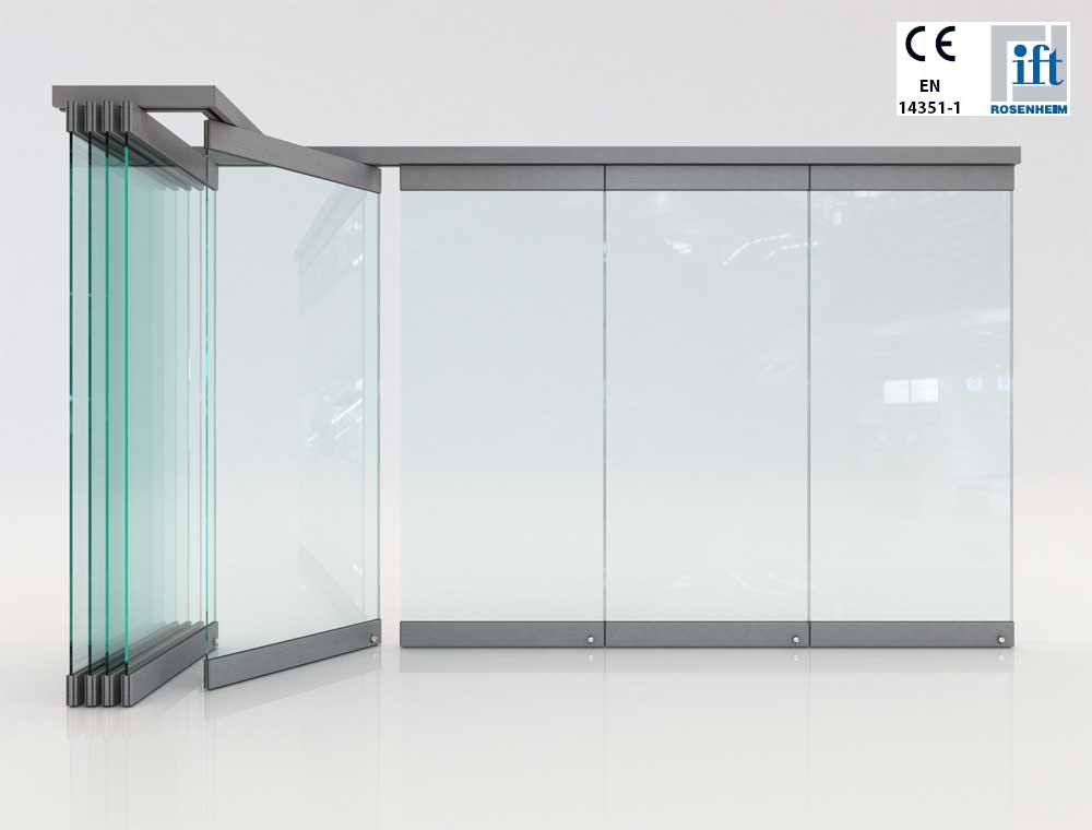 Στο πτυσσόμενο σύστημα F2 κάθε φύλλο διαθέτει άνω και κάτω προφίλ αλουμινίου (μπάζες) για να συγκρατούν το κρύσταλλο. Κάθε πόρτα κλειδώνει με κλειδαριές ή σύρτες δαπέδου. Οι διαστάσεις των κρυστάλλων μπορούν να προσαρμοστούν, λαμβάνοντας υπ’ όψιν την μορφολογία του δαπέδου και όποιες άλλες ιδιαιτερότητες της εγκατάστασης. Η κίνηση των πορτών γίνεται εύκολα, καθώς τα ράουλα κινούνται σ’ έναν οδηγό τοποθετημένο στην οροφή. Μπορούν να παρκάρουν σ’ έναν προεπιλεγμένο χώρο, χωρίς να χρειάζεται επιπλέον οδηγός δαπέδου. Κάθε πάνελ είναι αυτόνομο, κάτι που του επιτρέπει να περιστραφεί και να οδηγηθεί στον χώρο αποθήκευσής του. Κάθε πάνελ μπορεί, επίσης, να διαμορφωθεί ως ανοιγόμενη / εκτρεπόμενη πόρτα (με έναν επιπλέον μηχανισμό που τοποθετείται στο πάνελ), ώστε να λειτουργήσει σαν είσοδος. Τα προφίλ αλουμινίου μπορούν να βαφτούν με χρώμα από μια μεγάλη γκάμα: φυσική ανοδίωση και απομίμηση inox, καθώς επίσης και με ηλεκτροστατική βαφή, διαλέγοντας από μια ανεξάντλητη γκάμα χρωμάτων και υφών.