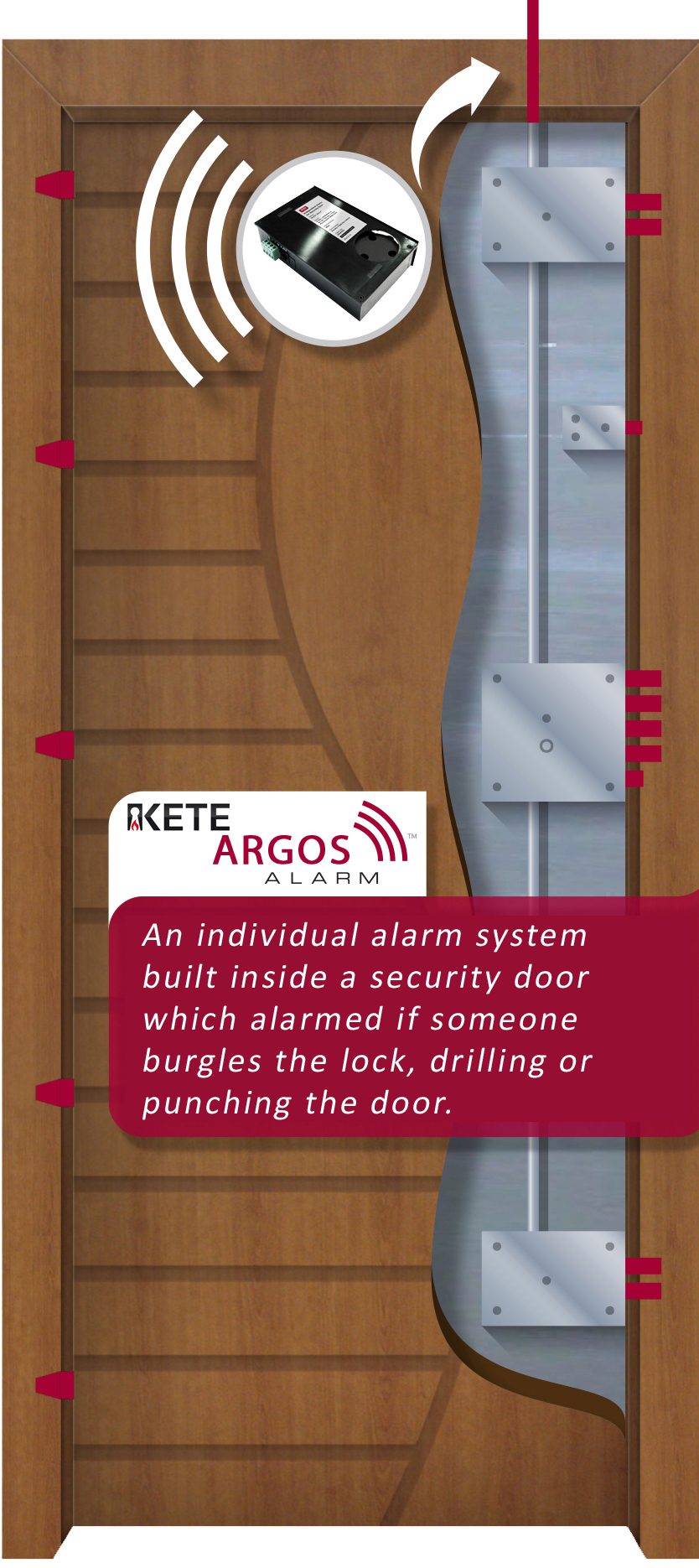3) Διάτρησης λαμαρίνας: Ανιχνεύει διαρκώς την παραβίαση της λαμαρίνας στην περιοχή εγκατάστασης της συσκευής. Υπάρχει επίσης η δυνατότητα επέκτασης για όλη την πόρτα.