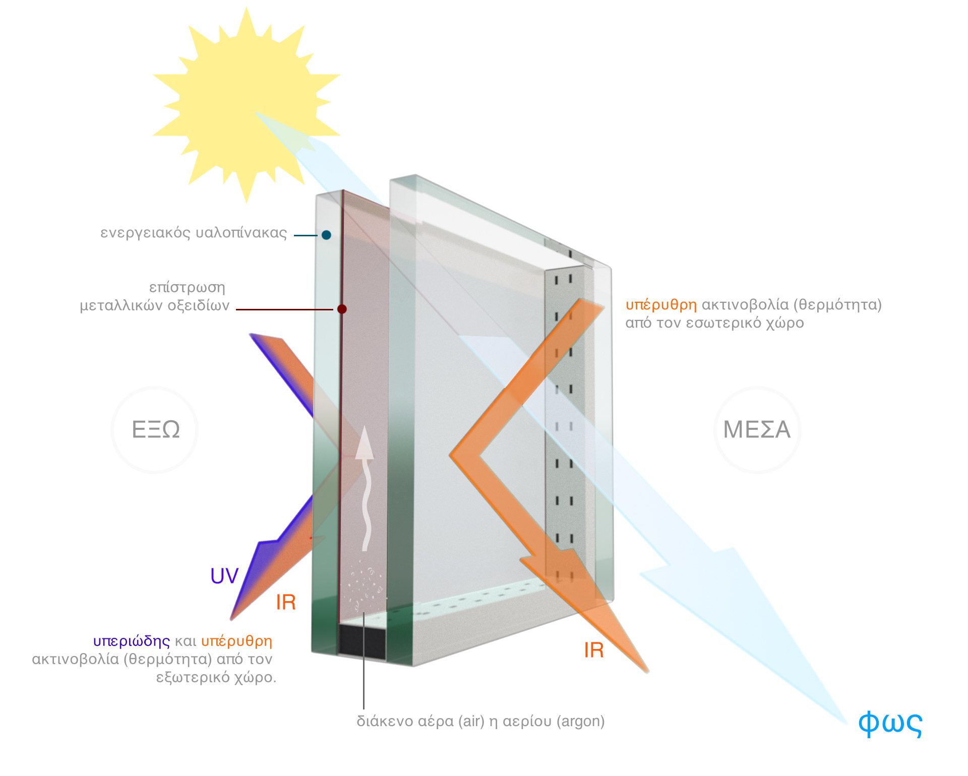 Το ενεργειακό γυαλί νέας γενιάς είναι ένα διάφανο γυαλί με μια επίστρωση μικροσκοπικών μεταλλικών οξειδίων στη μία του πλευρά, η οποία δεν επιτρέπει τη μεταφορά θερμότητας από τον εσωτερικό χώρο του σπιτιού στον εξωτερικό περιβάλλοντα χώρο ή και αντίστροφα. Ενεργειακοί υαλοπίνακες ή υαλοπίνακες νέας γενιάς χαμηλής εκπομπής είναι τα γυαλιά που επιτρέπουν στο φως να περάσει μέσα από αυτά παρέχοντας ταυτόχρονα θερμική μόνωση. Αυτό είναι το αποτέλεσμα της ειδικής επίστρωσης μετάλλων που βρίσκεται στην εσωτερική πλευρά ενός εκ των δύο γυαλιών (στους διπλούς υαλοπίνακες), η οποία εμφανίζει υψηλή ανακλαστικότητα στο υπέρυθρο τμήμα της ακτινοβολίας. Οι επιστρώσεις αυτές μπορεί να φέρουν διάφορους τόνους χρωμάτων, άλλες περισσότερο κι άλλες λιγότερο, με αποτέλεσμα ο υαλοπίνακας στην τελική του μορφή να έχει την απόχρωση που επιθυμούμε.