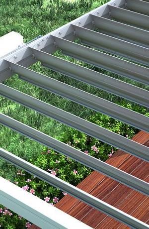 Πέργκολα που αποτελείται από κινητά πτερύγια σκίασης 200 mm. Για την κάλυψη από την ηλιακή ακτινοβολία, τα πτερύγια σκίασης στρέφονται προς την επιθυμητή κατεύθυνση, με τη χρήση χειροκίνητου μηχανισμού.